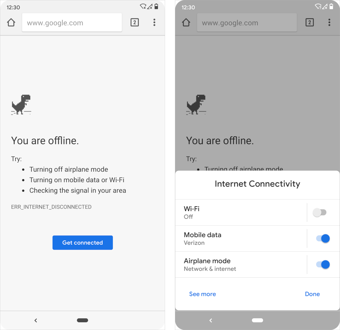 উদাহরণস্বরূপ, ধরুন একজন ব্যবহারকারী যখন তার ডিভাইসটি বিমান মোডে থাকে তখন একটি ওয়েব ব্রাউজার খোলেন। অ্যান্ড্রয়েড ১০ এর আগে, অ্যাপটি কেবল একটি সাধারণ বার্তা প্রদর্শন করত যা ব্যবহারকারীকে সংযোগ পুনরুদ্ধারের জন্য সেটিংস খুলতে বলে। অ্যান্ড্রয়েড ১০ এর মাধ্যমে, ব্রাউজার অ্যাপটি একটি ইনলাইন প্যানেল প্রদর্শন করতে পারে যা বিমান মোড, ওয়াই-ফাই (কাছাকাছি নেটওয়ার্ক সহ) এবং মোবাইল ডেটার মতো গুরুত্বপূর্ণ সংযোগ সেটিংস দেখায়। এই প্যানেলের সাহায্যে, ব্যবহারকারীরা অ্যাপটি ছাড়াই সংযোগ পুনরুদ্ধার করতে পারেন।