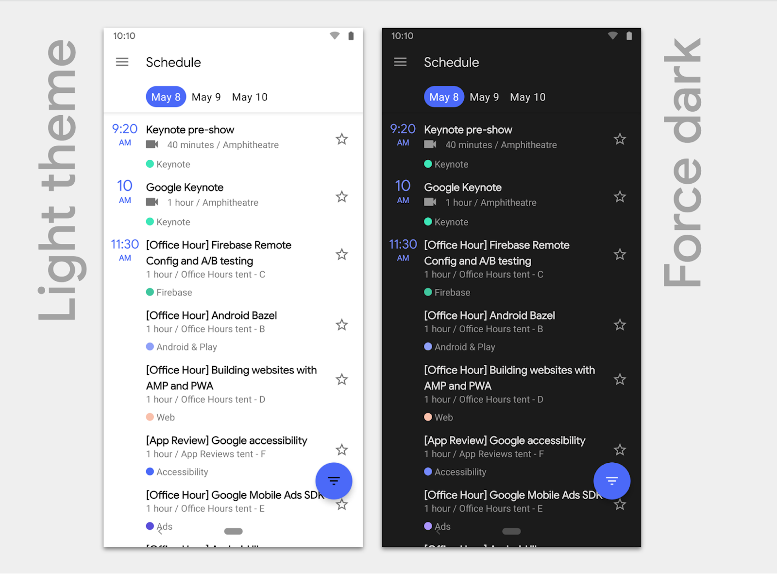 Android 10은 어두운 테마 강제 적용 기능을 사용하여 앱의 어두운 테마를 동적으로 만들 수 있습니다.