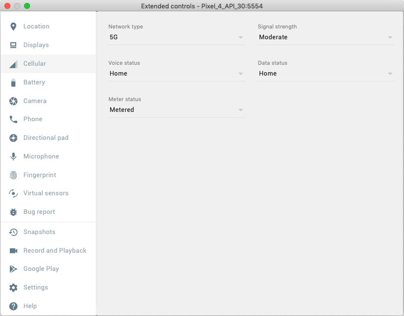 Android 11 menambahkan 5G API untuk memungkinkan aplikasi Anda menambahkan fitur mutakhir. Untuk menguji fitur saat menambahkannya, Anda dapat menggunakan kemampuan baru emulator Android SDK. Fungsi baru ditambahkan di Emulator versi 30.0.22. Memilih setelan jaringan 5G menetapkan TelephonyDisplayInfo ke OVERRIDE_NETWORK_TYPE_NR_NSA, mengubah estimasi bandwidth, dan memungkinkan Anda menetapkan status koneksi berbayar untuk memverifikasi bahwa aplikasi Anda merespons dengan tepat perubahan NET_CAPABILITY_TEMPORARILY_NOT_METERED status.