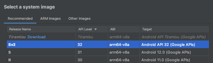 Cari image sistem 12L bernama Android API 32, lalu klik Download untuk mendapatkannya. Setelah download selesai, pilih image sistem ini, lalu klik Next.