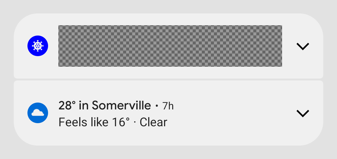 Android 12를 타겟팅하는 앱의 경우 맞춤 콘텐츠 뷰가 포함된 알림은 더 이상 전체 알림 영역을 사용하지 않습니다. 대신 시스템에서 표준 템플릿을 적용합니다. 이 템플릿은 맞춤 알림이 알림의 아이콘 및 확장 어포던스(접힌 상태)와 알림의 아이콘, 앱 이름, 축소 어포던스(펼친 상태) 등 모든 상태에서 다른 알림과 동일한 장식을 보유하도록 합니다. 이 동작은 Notification.DecoratedCustomViewStyle의 동작과 거의 동일합니다.