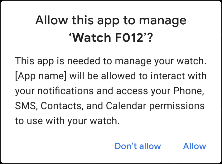 Android 12 (एपीआई लेवल 31) और इसके बाद के वर्शन पर काम करने वाले पार्टनर ऐप्लिकेशन, स्मार्टवॉच से कनेक्ट होने पर कंपैनियन डिवाइस की प्रोफ़ाइलों का इस्तेमाल कर सकते हैं. प्रोफ़ाइल का इस्तेमाल करने से, डिवाइस के टाइप के हिसाब से अनुमतियों के सेट को एक ही चरण में बंडल करके, रजिस्ट्रेशन की प्रोसेस को आसान बनाया जा सकता है.