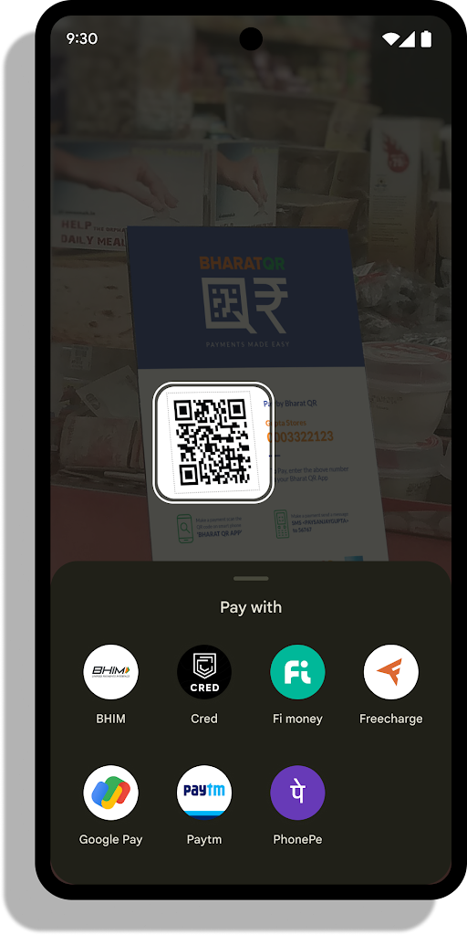O Android 13 (com compatibilidade com versões anteriores do Android 12) oferece suporte a fluxos de pagamento da UPI adicionando um leitor de código QR dedicado que os usuários podem acessar diretamente do bloco de Configurações rápidas correspondente. Os usuários podem iniciar um fluxo de pagamento da UPI lendo um código QR da câmera ao vivo ou de uma imagem estática.