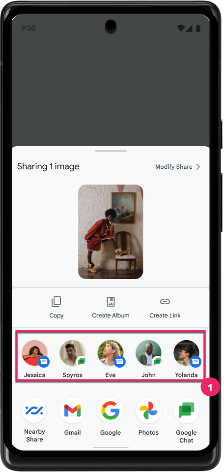 Android 14 では、アプリからの多数のシグナルを使用して、直接共有ターゲットのランキングを決定し、より有用な結果をユーザーに提供しています。ランキングに最も有用なシグナルを提供するには、直接共有ターゲットのランキングを改善するためのガイダンスに沿って対応してください。通信アプリは、送受信メッセージのショートカットの使用状況を報告することもできます。
