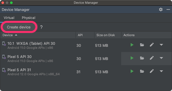 4. Android Studio'da Tools > Device Manager'ı (Araçlar > Cihaz Yöneticisi) tıklayın, ardından Device Manager (Cihaz Yöneticisi) panelinde Create device'ı (Cihaz oluştur) tıklayın.