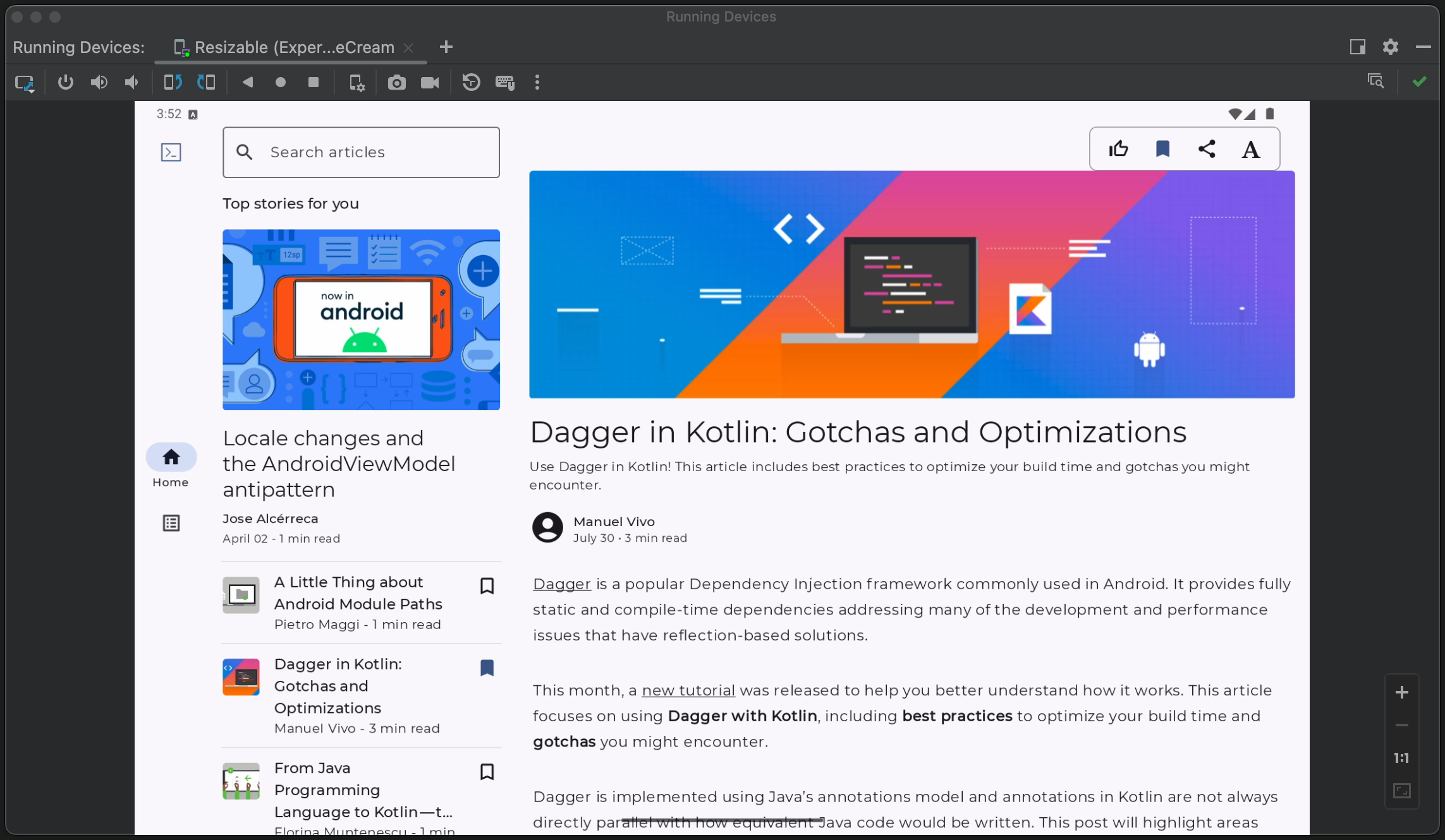 Fleksibilitas ini mempermudah validasi tata letak Anda pada waktu desain dan menguji perilaku saat runtime, menggunakan perangkat referensi yang sama. Untuk membuat emulator baru yang dapat diubah ukurannya, gunakan Pengelola Perangkat di Android Studio untuk membuat perangkat virtual baru dan memilih definisi perangkat yang Resizable dalam kategori Phone.