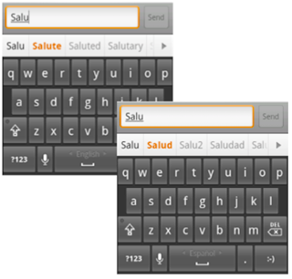 Multi-lingual users can add multiple languages to the keyboard and switch between multiple Latin-based input languages by swiping across the space bar. This changes the keys as well as the auto-suggest dictionary. |