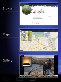 چندوظیفه ای یک نقطه قوت کلیدی اندروید است و در تجربه اندروید 3.0 مرکزی است. هنگامی که کاربران برنامه هایی را برای انجام وظایف مختلف راه اندازی می کنند، می توانند از لیست برنامه های اخیر در نوار سیستم استفاده کنند تا کارهای در دست اجرا را ببینند و به سرعت از یک زمینه برنامه به زمینه دیگر بپرند. برای کمک به کاربران برای شناسایی سریع کار مرتبط با هر برنامه، لیست یک عکس فوری از وضعیت واقعی آن زمانی که کاربر آخرین بار آن را مشاهده کرده را نشان می دهد.