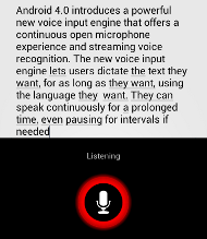 Android 4.0 では、連続的な「オープン マイク」機能とストリーミング音声認識を提供する、強力な新しい音声入力エンジンが導入されています。新しい音声入力エンジンでは、ユーザーが任意の言語で、任意の長さのテキストを音声入力できます。ユーザーは長時間にわたって連続して話すことができます。必要に応じて休憩を挟むこともできます。句読点も音声入力して、正しい文章を作成できます。音声入力エンジンがテキストを入力すると、起こりうる音声入力ミスが灰色の下線で示されます。音声入力後に、下線が引かれた単語をタップすると、候補のリストからその単語をすばやく置き換えることができます。