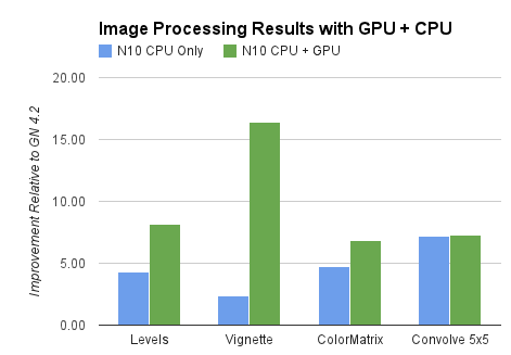 Android 4.1 étend le calcul Renderscript pour vous offrir plus de flexibilité. Vous pouvez désormais échantillonner des textures dans vos scripts de calcul RenderScript. De plus, de nouveaux pragmas sont disponibles pour définir la précision à virgule flottante requise par vos scripts. Vous pouvez ainsi activer les instructions NEON telles que les opérations mathématiques vectorielles rapides sur le chemin du processeur, qui ne seraient pas possibles avec la norme IEEE 754-2008 complète.