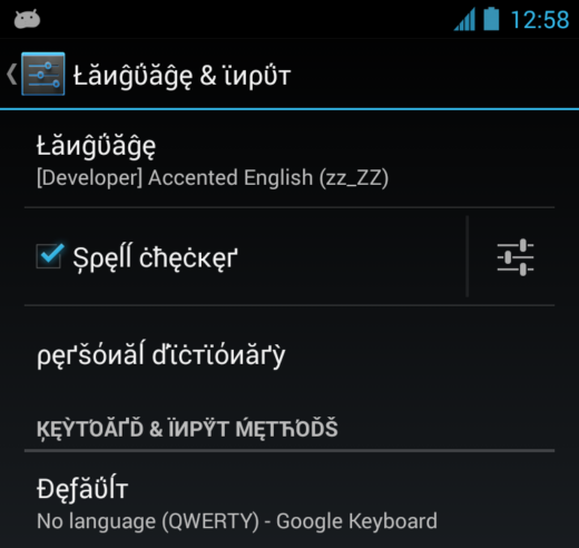 Para ajudar a testar seu app com mais facilidade em outras localidades, o Android 4.3 apresenta as pseudolocalidades como uma nova opção do desenvolvedor. As pseudolocalidades simulam o idioma, o script e as características de exibição associados a uma localidade ou grupo de idiomas. Atualmente, você pode testar com uma pseudolocalidade para Inglês acentuado, que permite ver como sua IU funciona com acentos de script e caracteres usados em vários idiomas europeus.
