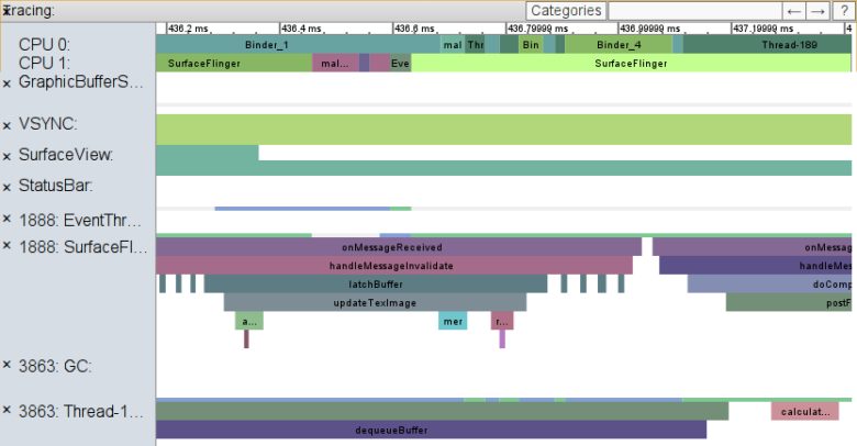 Para usos especializados, os aplicativos podem acessar o tempo de vsync por meio de APIs expostas pela nova classe Choreographer. Os aplicativos podem solicitar invalidação no próximo quadro de vsync. Essa é uma boa maneira de programar animações quando o aplicativo não estiver usando o framework de animação. Para usos mais avançados, os aplicativos podem publicar um retorno de chamada que a classe Choreographer executará no próximo quadro.