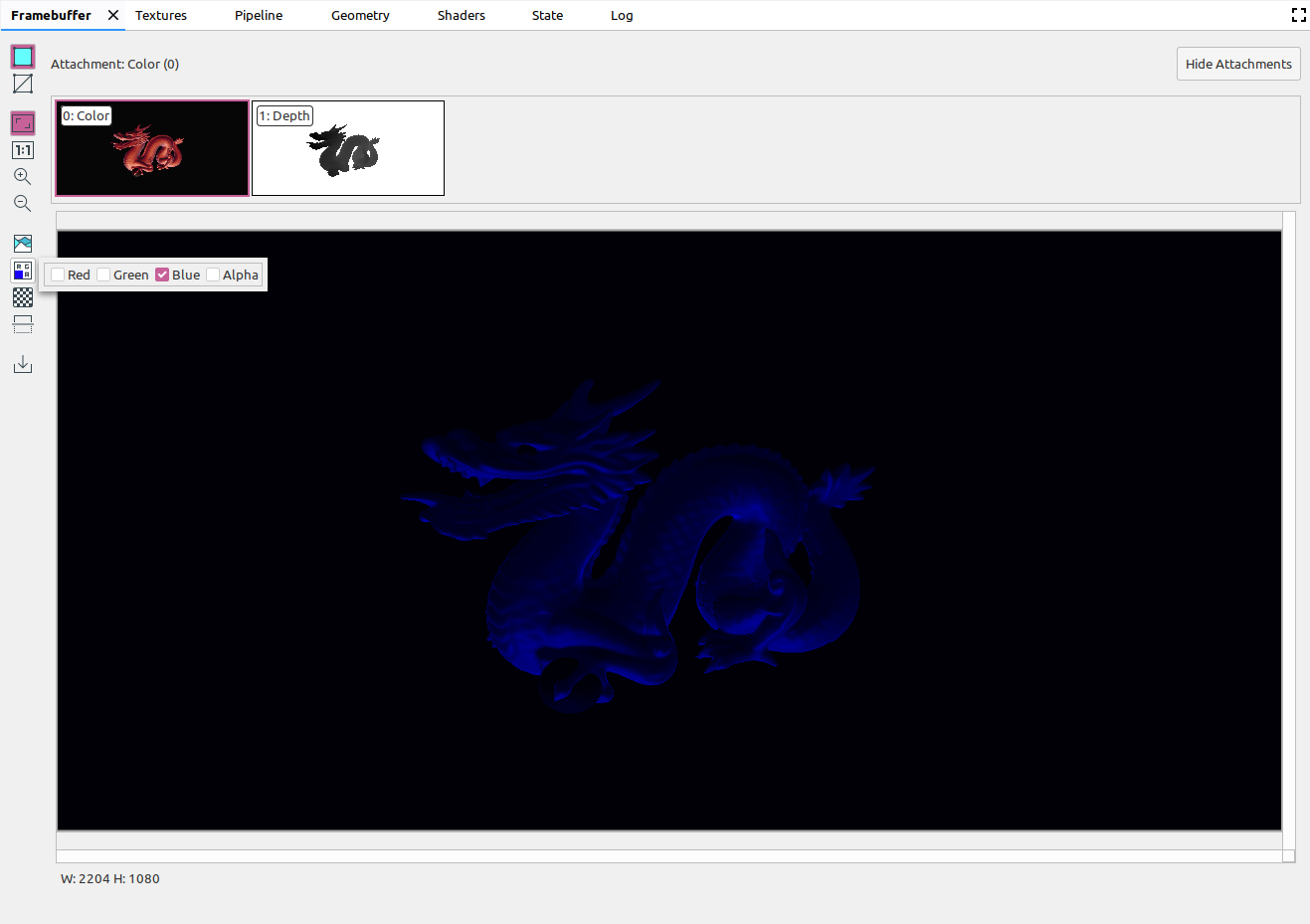 Um framebuffer pode conter vários anexos. Selecione o anexo a ser exibido e clique em Mostrar anexos ou Ocultar anexos, conforme necessário. As miniaturas dos anexos são rotuladas com o tipo dele (por exemplo, COLOR, DEPTH e INPUT), além do índice.