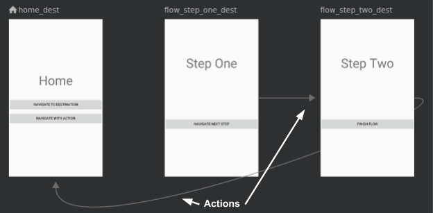 Le graphique de navigation affiche les destinations disponibles. Les flèches entre les destinations sont appelées actions. Ces actions seront décrites plus en détail dans la suite de cet atelier.