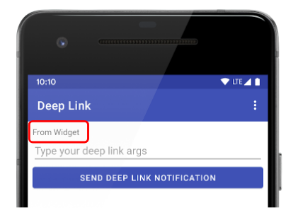 4. Presiona el widget y verifica que el destino de Android se abra con el argumento correcto. Debería decir "From Widget" en la parte superior, ya que ese es el argumento que pasaste en DeepLinkAppWidgetProvider.