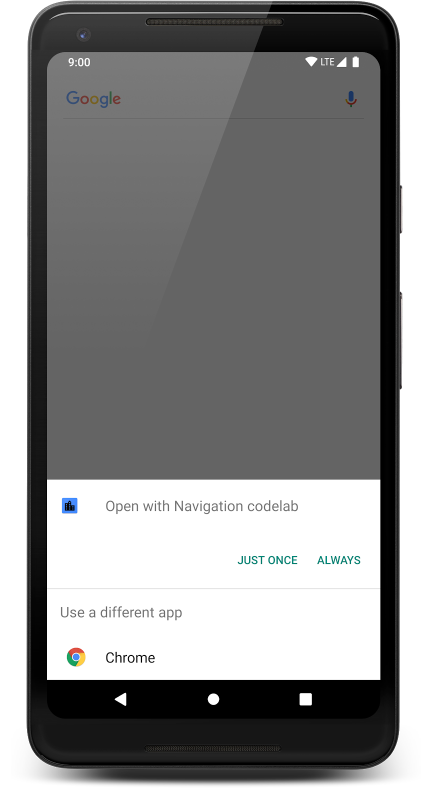 - Navega con Google app. Debería permitirte colocar www.example.com/urlTest en la barra de búsqueda para que aparezca la ventana de desambiguación. Selecciona Codelab de Navigation.