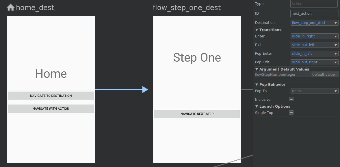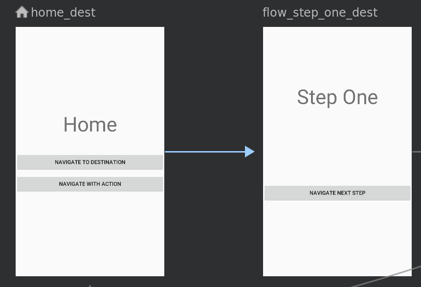 El gráfico de navegación muestra los destinos disponibles. Las flechas entre los destinos se denominan acciones. Más adelante, obtendrás más información sobre las acciones.