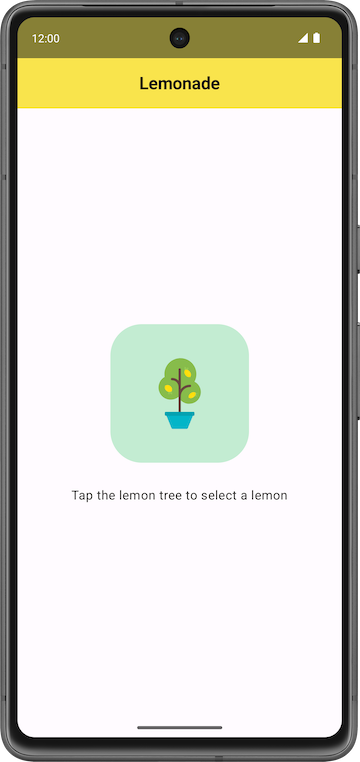 Pertama, ubah aplikasi agar menampilkan gambar pohon lemon dan label teks yang sesuai, yang bertuliskan Tap the lemon tree to select a lemon, di bagian tengah layar. Seharusnya juga ada 16dp spasi di antara teks dan gambar di bawahnya.