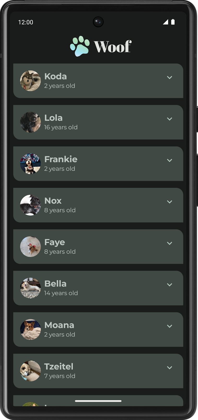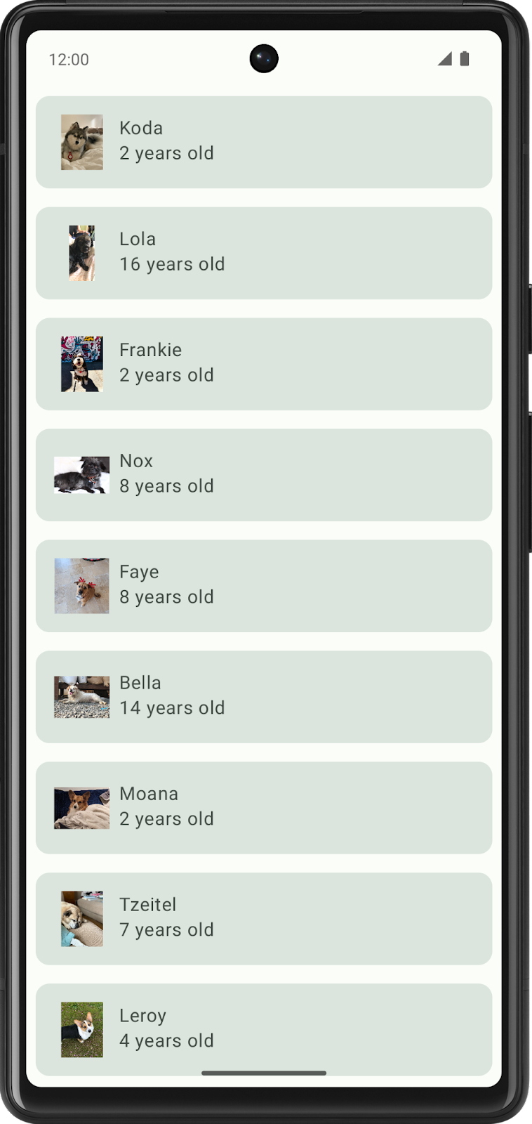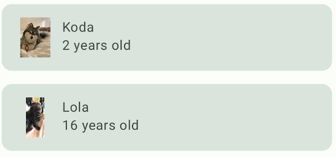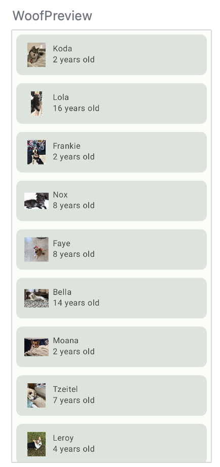 WoofApp()contiene unaLazyColumnque muestra losDogItem.DogItem()contiene unaRowque muestra una foto y la información del perro.DogIcon()muestra una foto del perro.DogInformation()muestra el nombre y la edad del perro.WoofPreview()te permite obtener una vista previa de la app en el panel Design.