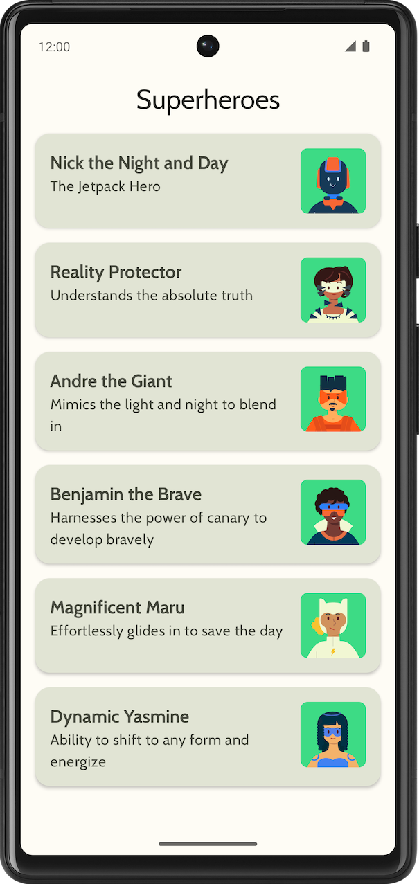 En esta práctica guiada, crearás una app de superhéroes con los conceptos que aprendiste en esta ruta de aprendizaje. La app se enfoca en la creación de los componentes necesarios para compilar una lista desplazable y una IU mejorada con los principios de Material Design que aprendiste en el codelab Temas de Material con Jetpack Compose.