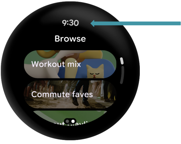 TimeTextwhich uses curved text under the hood and gives developers an easy way to show the time without placing the composable or having to do any work with time related classes. Additionally, the Material Guidelines recommend that you display the time at the top of any screen within the app and it fades away while scrolling. - A