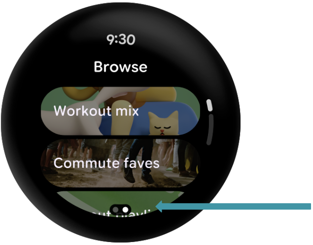 Un appareil rond étant plus petit en haut et en bas, il y a moins de place pour afficher les éléments. C'est pourquoi Wear OS possède sa propre version de LazyColumn pour mieux prendre en charge ce type d'appareil.