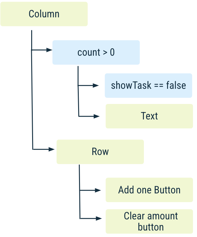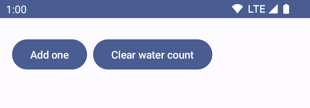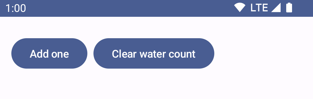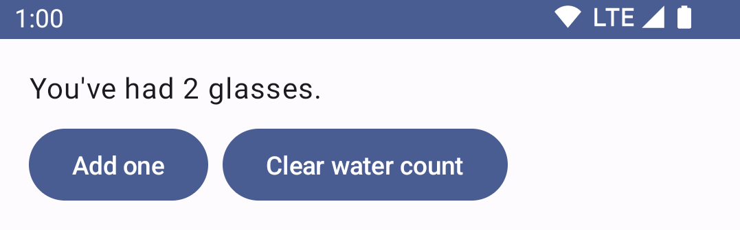 L'état de la fonction composable WaterCounter correspond à la variable count. Cependant, l'utilité d'un état statique est limitée, car il ne peut pas être modifié. Pour y remédier, vous allez ajouter un Button afin d'augmenter le nombre de verres d'eau que vous buvez et d'effectuer le suivi de la quantité bue tout au long de la journée.
