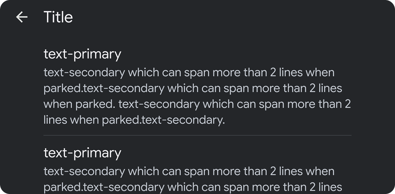 - हर आइटम के लिए टेक्स्ट की मात्रा. 'सिर्फ़ पार्क किया गया' मोड में, सूची की पंक्तियों में मौजूद सेकंडरी टेक्स्ट दो लाइनों से ज़्यादा हो सकता है. गाड़ी पार्क होने के दौरान, सूची में मौजूद ज़्यादा टेक्स्ट देखें.