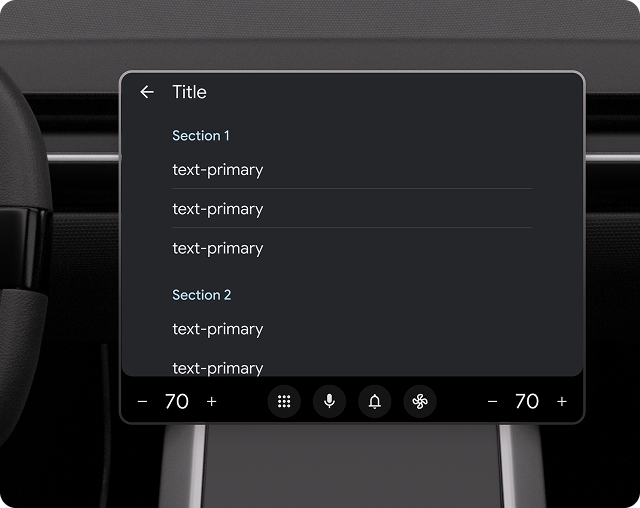 हर सूची की लाइन में मौजूद सेकंडरी टेक्स्ट की मात्रा अलग-अलग होती है. यह इस बात पर निर्भर करती है कि कार पार्क की गई है या चल रही है. गाड़ी चलाते समय ध्यान कम भटके, इसके लिए टेक्स्ट को दो लाइनों में छोटा कर दिया जाता है. ड्राइविंग के दौरान पढ़े जाने वाले किसी भी टेक्स्ट को सेकंडरी टेक्स्ट की शुरुआत में दिखाया जाना चाहिए.