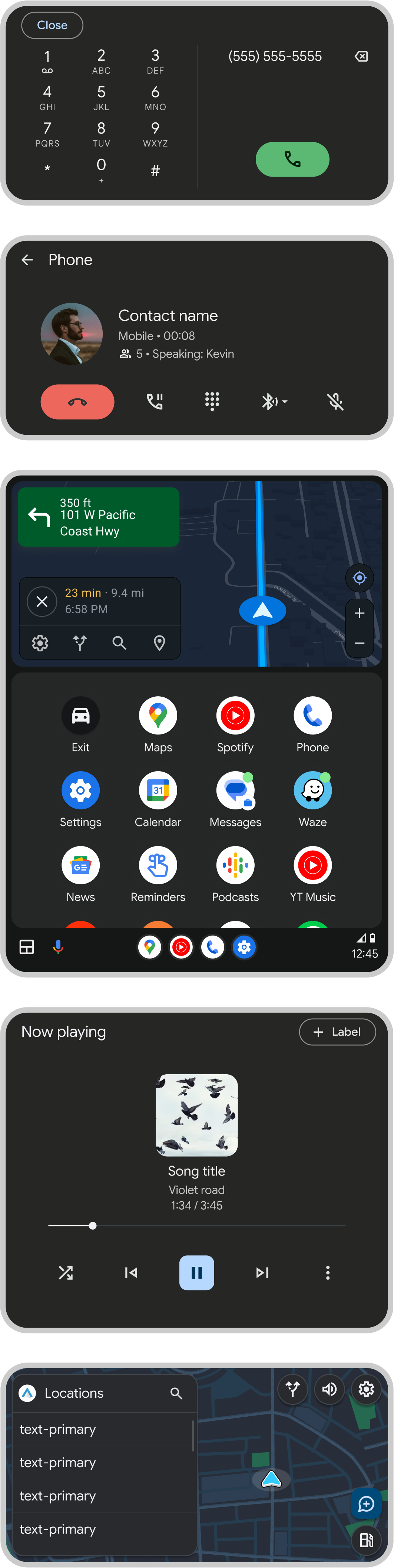 התבניות כוללות רכיבים שמשמשים כאבני בניין ליצירת חוויית משתמש עקבית בכל האפליקציות לרכב.