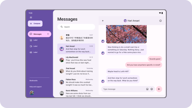 Reply の Jetpack Compose 実装(アダプティブ デザインのマテリアル デザイン調査)。