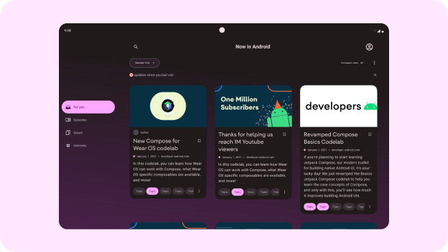 大画面正規化レイアウトは、大画面デバイスで最適なユーザー エクスペリエンスを提供できる、実証済みのデザイン パターンです。このレイアウトはレスポンシブで適応性があり、小画面のスマートフォンのほか、タブレット、折りたたみ式デバイス、ChromeOS デバイスにも対応しています。