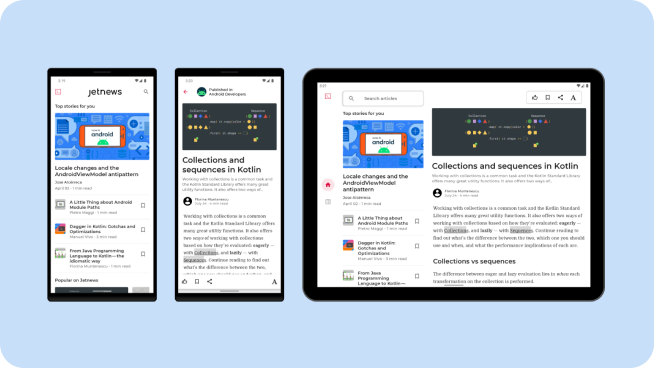 大画面正規化レイアウトは、大画面デバイスで最適なユーザー エクスペリエンスを提供できる、実証済みのデザイン パターンです。このレイアウトはレスポンシブで適応性があり、小画面のスマートフォンのほか、タブレット、折りたたみ式デバイス、ChromeOS デバイスにも対応しています。