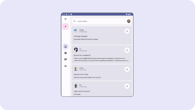 大螢幕標準版面配置是經過實證的設計模式,可在大螢幕裝置上提供最佳的使用者體驗。這類版面配置採用回應式及調適性設計,支援小螢幕手機、平板電腦、折疊式裝置和 ChromeOS 裝置。