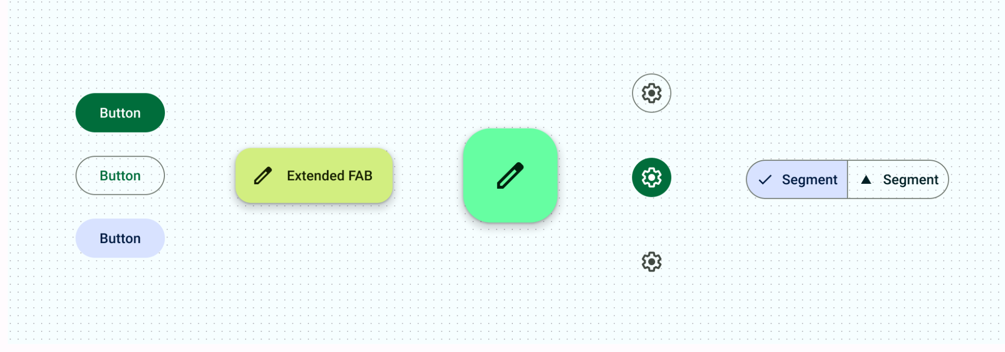 Material Design ma kilka rodzajów przycisków, które pomagają określać priorytet działań i interakcji w różnych kontekstach. Od pływających przycisków czynności lub rozszerzonych pływających przycisków czynności w przypadku działań podstawowych po pomocnicze przyciski z ikonami i wybieranie opcji za pomocą przycisków segmentowych.