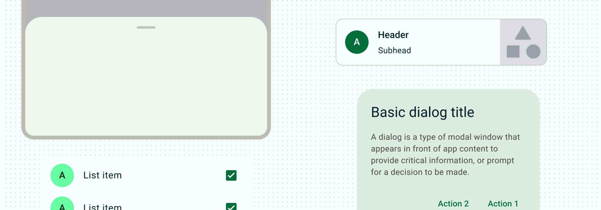 Komponenty kontenera zawierają informacje i działania, w tym inne komponenty, takie jak przyciski, menu czy elementy. Większość komponentów Material korzysta z jawnego ograniczenia, grupując powiązane treści i działania za pomocą obiektów wizualnych: kart, okien dialogowych, arkuszy dolnych, arkuszy bocznych, karuzel i dymków. Listy mogą być dostarczane z niejawnym lub jawnym ograniczeniem przez wyświetlanie widocznych separatorów. Te komponenty zapewniają typowe wzorce wyświetlania grup treści.