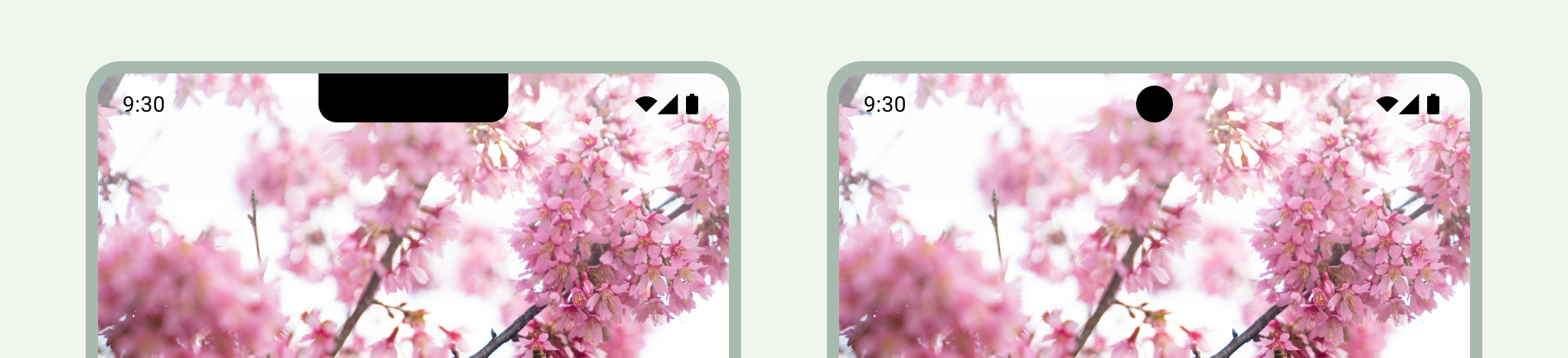 ডিসপ্লে কাটআউট হল কিছু ডিভাইসের এমন একটি জায়গা যা ডিসপ্লে পৃষ্ঠের মধ্যে বিস্তৃত থাকে এবং সামনের দিকে মুখ করা সেন্সরগুলির জন্য জায়গা প্রদান করে। ডিসপ্লে কাটআউটগুলি নির্মাতার উপর নির্ভর করে পরিবর্তিত হতে পারে। ডিসপ্লে কাটআউটগুলি কীভাবে কন্টেন্ট, ওরিয়েন্টেশন এবং এজ-টু-এজ এর সাথে ইন্টারঅ্যাক্ট করবে তা বিবেচনা করুন।