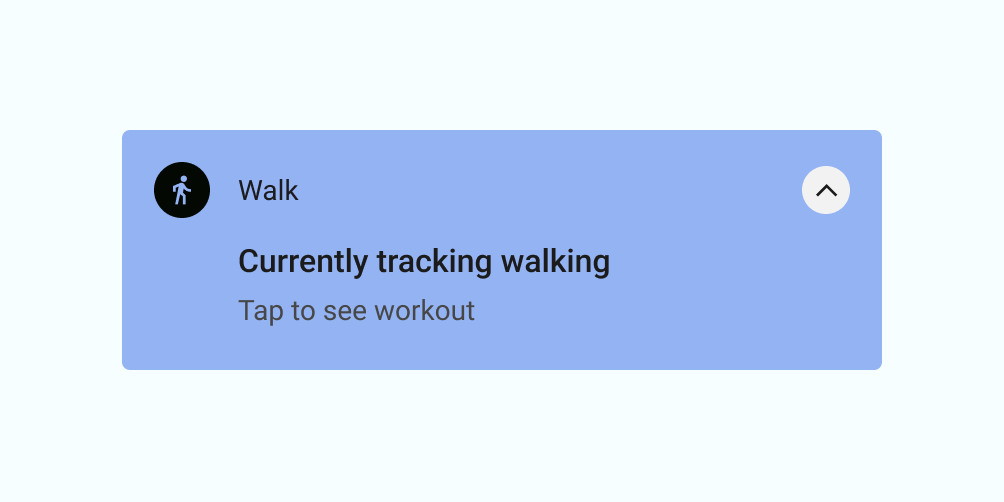 L'esempio seguente mostra una notifica di un'app per il fitness. L'utente ha avviato una sessione di allenamento attiva, che esegue l'inizializzazione di un servizio in primo piano che monitora la sessione di allenamento. L'app mostra la notifica per indicare che sta monitorando la camminata, con un'opzione per visualizzare l'allenamento.
