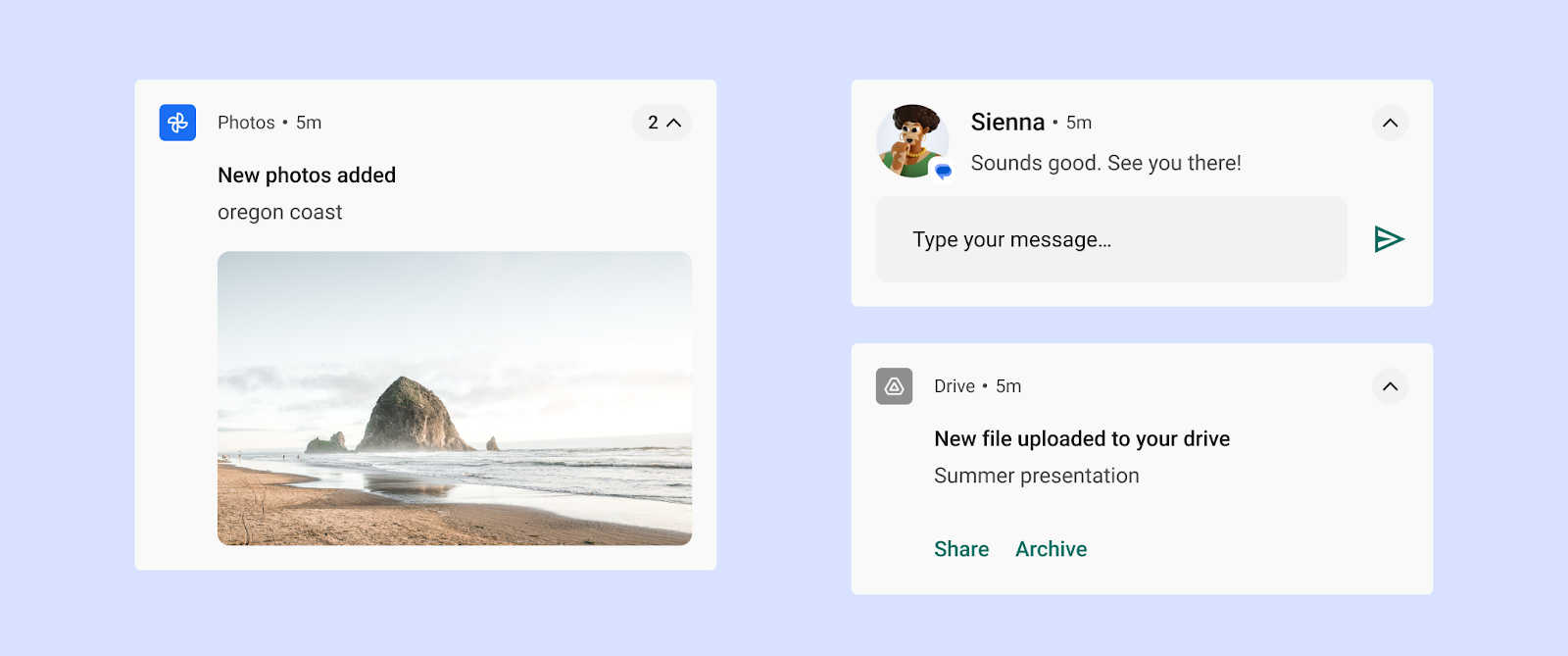 Consenti all'utente di digitare direttamente in una notifica includendo un'azione di risposta. È progettato per digitare una piccola quantità di testo, ad esempio per rispondere a un messaggio o prendere una breve nota.
