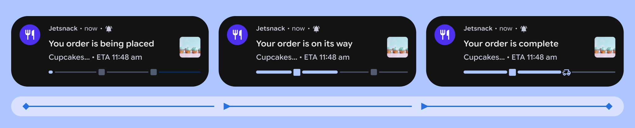 实时更新会提供重要更新的摘要,以便用户无需打开应用即可跟踪进度。用户可以暂时关闭实时更新通知,或将其降级为标准通知。实时更新通知应遵循通知原则,提供简洁、及时且相关的信息。