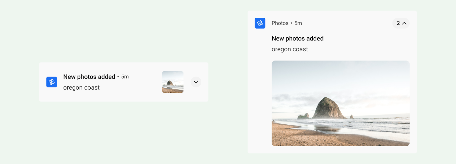 大型圖片範本適用於含有圖片的通知。收合後,通知會顯示大圖片縮圖圖示。展開後,通知會顯示更大的預覽畫面。