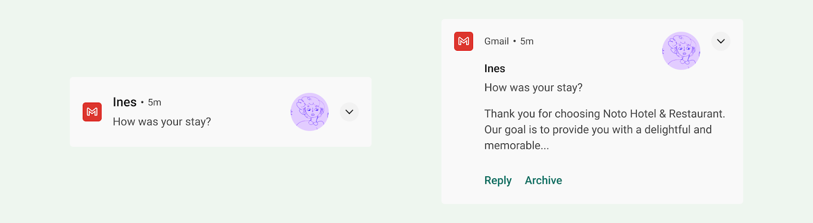 - 根據使用者內容提供文字按鈕、輸入內容或媒體控制項等動作,讓使用者清楚瞭解通知的功能。