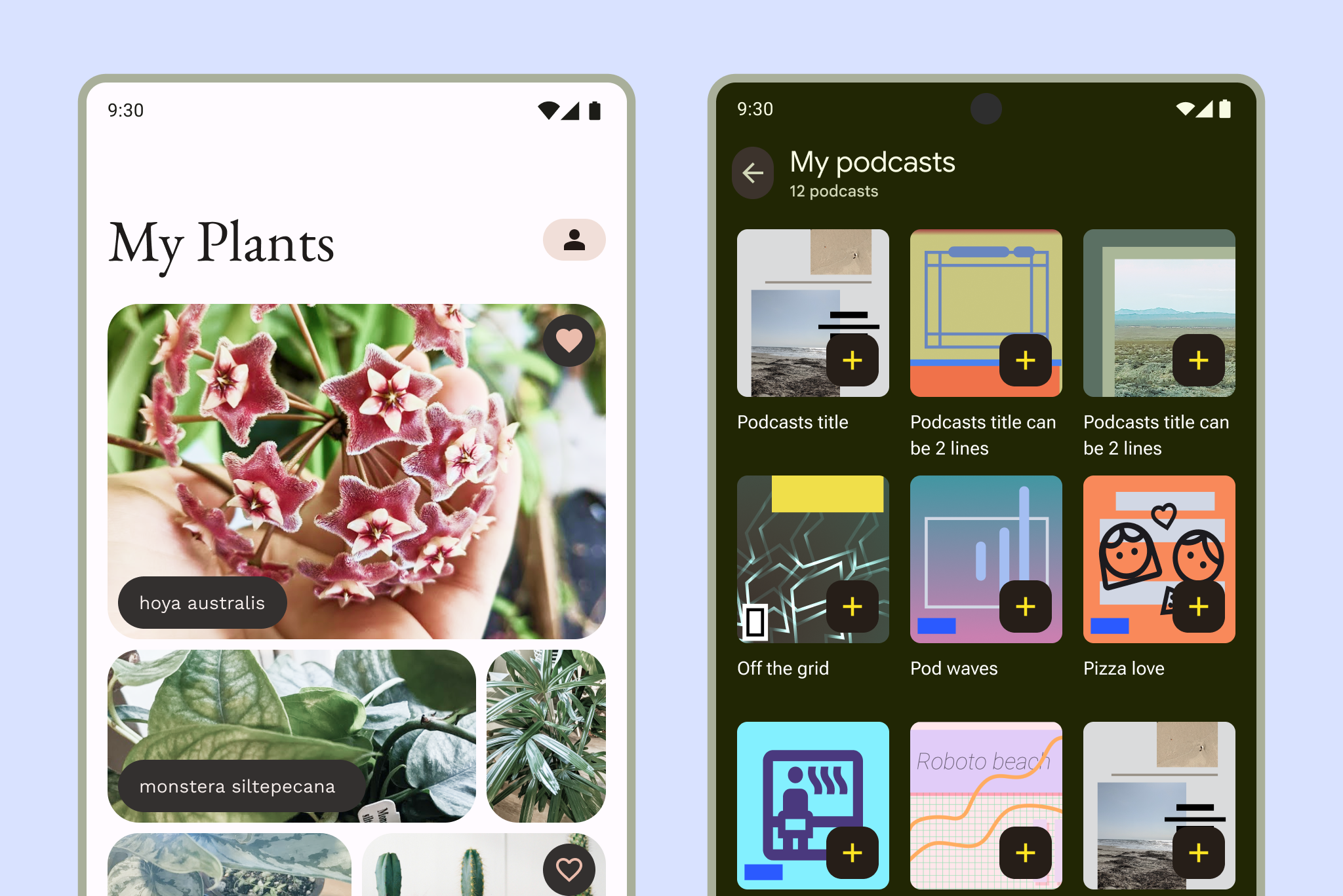 প্রারম্ভিক বিন্দু হিসাবে ক্যানোনিকাল লেআউটগুলি ব্যবহার করুন, ব্যবহারের জন্য প্রস্তুত রচনাগুলি যা লেআউটগুলিকে সাধারণ ব্যবহারের ক্ষেত্রে এবং স্ক্রীনের আকারের জন্য মানিয়ে নিতে সহায়তা করে৷ এই লেআউটগুলি নান্দনিক এবং কার্যকরী, এবং উপাদান 3 নির্দেশিকা থেকে উদ্ভূত।