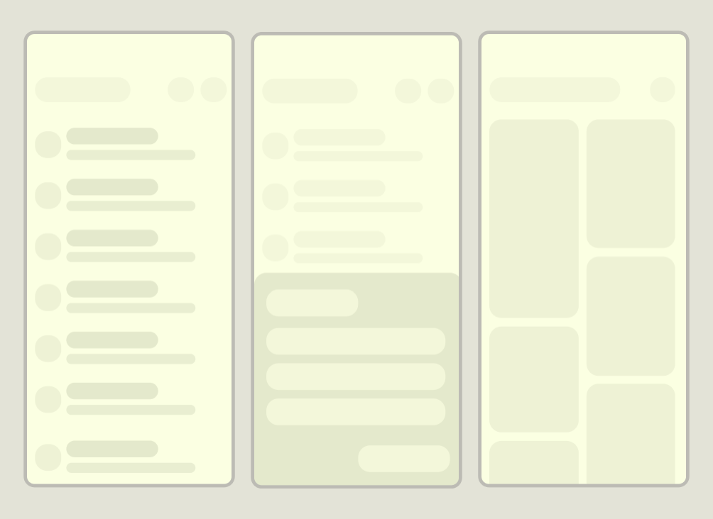نمای تلفن همراه ممکن است به محتوا یا کنترل های پشتیبانی نیاز داشته باشد. معمولاً بهصورت برگهها یا دیالوگها، میتوانند به نمای اصلی کمک کنند تا متمرکز و بینظم بماند. راهنمای M3 را برای استفاده از طرح بندی متعارف پانل پشتیبان بررسی کنید.