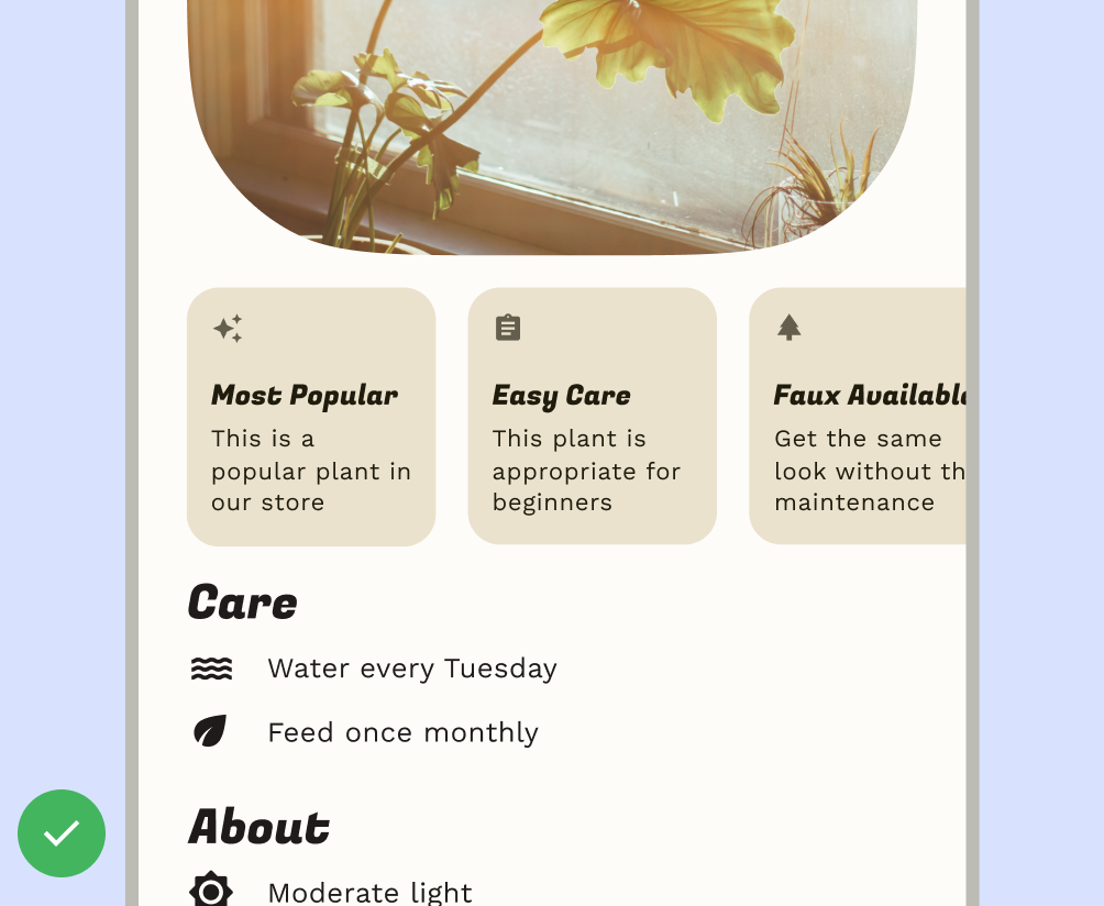 Compose proporciona diseños convenientes para combinar componentes de Material en patrones de pantalla comunes. Los elementos componibles, como Scaffold, proporcionan espacios para varios componentes y otros elementos de pantalla. Obtén más información sobre los componentes y el diseño de Material.