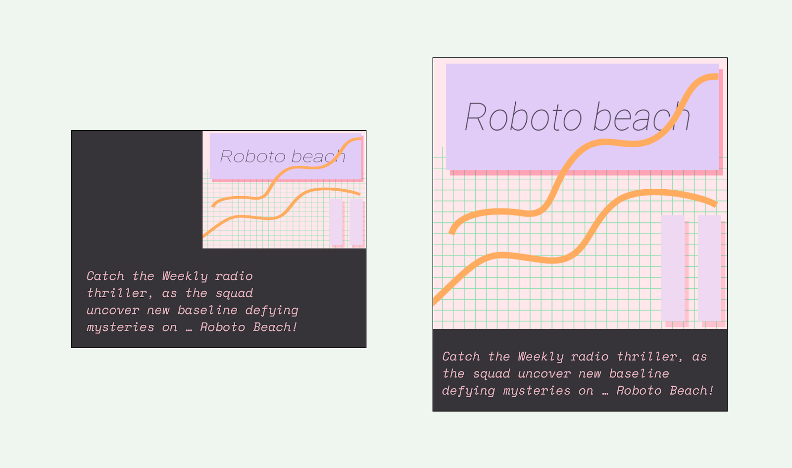 Aşağıdaki şekilde, başlığı ve birincil metni kapsamak için örtülü kapsama kullanımına dair bir örnek gösterilmektedir. Sütun ızgarası, öğeleri hizalamak ve gruplandırmak için kullanılır. Öne çıkan noktalar açıkça kartlarda yer alır. Daha fazla görsel ayrım için simgeler ve tür hiyerarşisi kullanma.