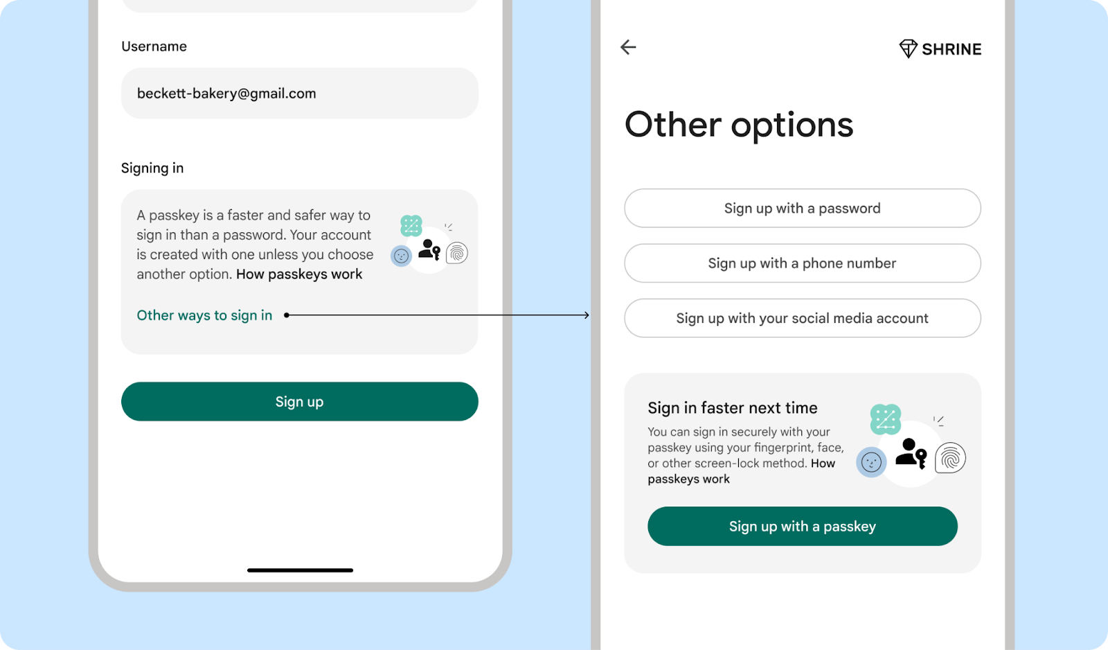 • Ürününüzde geçiş anahtarlarını desteklemek için Kimlik Bilgisi Yöneticisi API'sini kullanın. Kimlik Bilgisi Yöneticisi; şifre anahtarları, e-posta adresleri ve cihazlar dahil olmak üzere oturum açma çözümleri için de kullanılır. Böylece, tüm hesapların oturum açma seçeneklerini açıkladığınızdan emin olun.