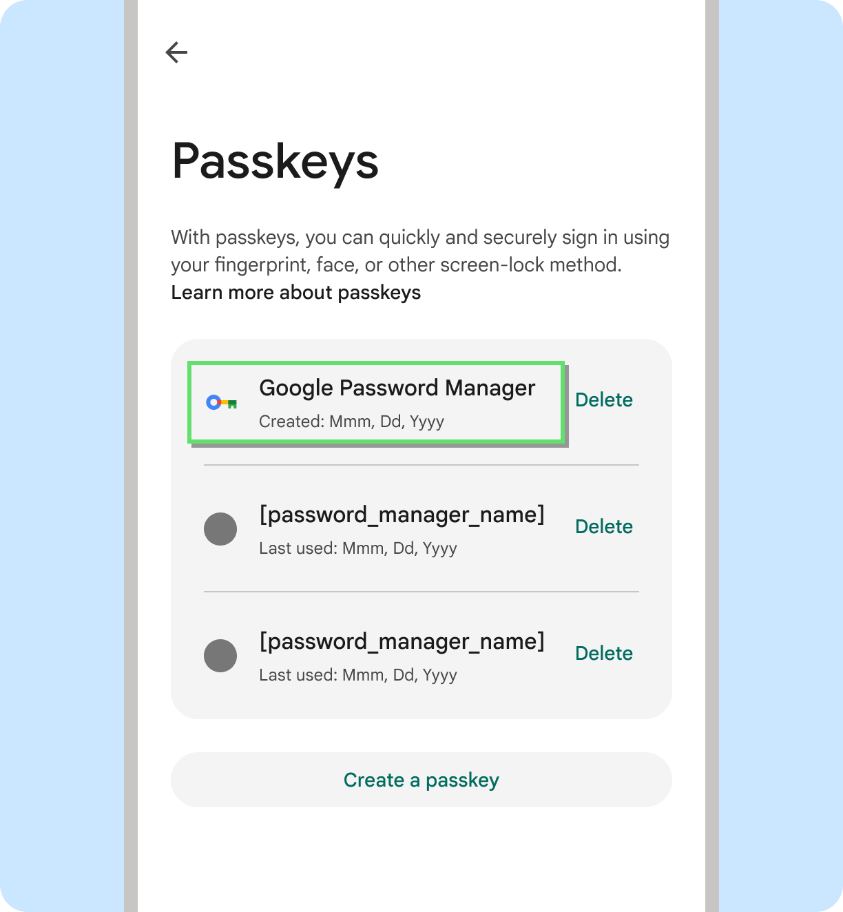 • Android 13 veya önceki sürümler: Geçiş anahtarları ve şifreler şuraya kaydedilir ve buradan alınır: Google Şifre Yöneticisi. Kullanıcılar, Google Hesaplarıyla oturum açarak geçiş anahtarlarını ve şifrelerini başka bir Android cihazda geri yükleyebilir.