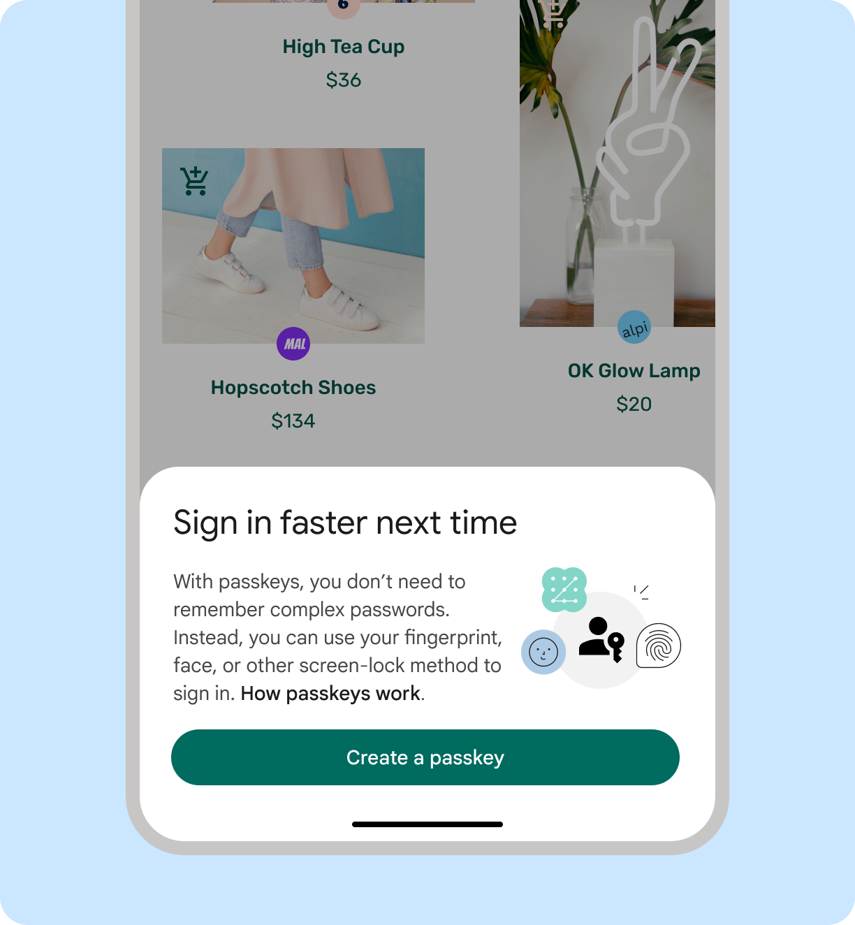 - 使用 Google 提供的密碼金鑰圖示來建立 Android 裝置提供一致的登入體驗