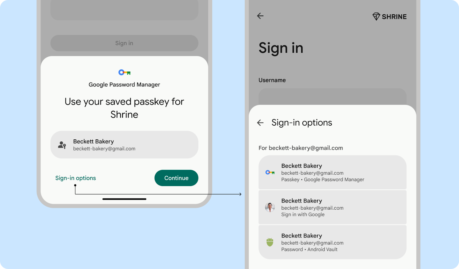 Credential Manager 整合各個帳戶的登入方式,並提供最安全簡單的驗證方法,讓登入流程更簡單。舉例來說,如果使用者同時擁有帳戶的密碼和密碼金鑰,系統會建議使用密碼金鑰。